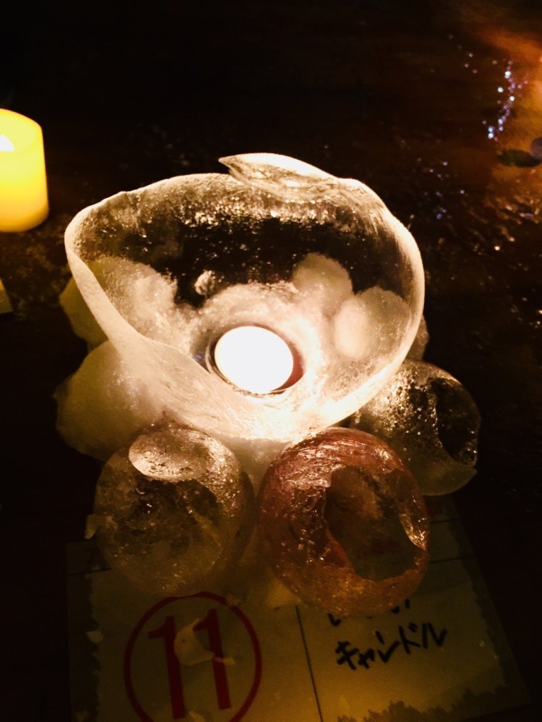 집에 돌아와 저녁을 차려먹은 뒤 따스한 집에 있고 싶은 귀찮은 몸을 일으켜 다카코상을 태우고 다시 축제현장으로 돌아왔다. 저녁이 되니 주최측에서 출품된 캔들들에 촛불을 하나씩 안에다가 넣어주었다. 어둠 속에서 보니까 서투른 흔적이 묻히고 촛불까지 켜니 부끄러운 내 아이스캔들 모양새가 그나마 조금 나아보인다. 작품에는 작품명만 써있고 참가자 이름은 없으니 사람들이 내가 만든건지 알리도 없고, 그것도 참 다행이군 싶다.