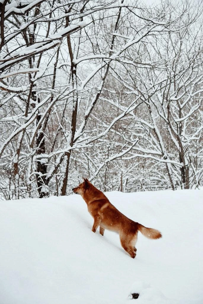 곰순이는 아침산책에 나서면 ‘얘가 12살 먹은 개 맞나?’ 싶을 정도로 엄청난 에너지를 발산하며 주변을 탐색한다. 추위나 차가운 눈따위가 두려울소냐. 사슴과 여우, 곰이 서식하는 숲이니 야생동물의 냄새때문에 흥분한 탓도 있으리라. 인적이 없는 숲길을 걸을 때는 줄을 풀어주곤 한다. 기다렸다는 듯이 신이 나서 1미터가 족히 될법한 깊이의 눈밭을 헤치며 돌아다니는 곰순이를 보는 것은 아침산책의 또 다른 즐거움. 다리가 눈에 묻혀서 몸만 보이는데 앞으로 나아가는 것이 마치 수영하는 것 같다.