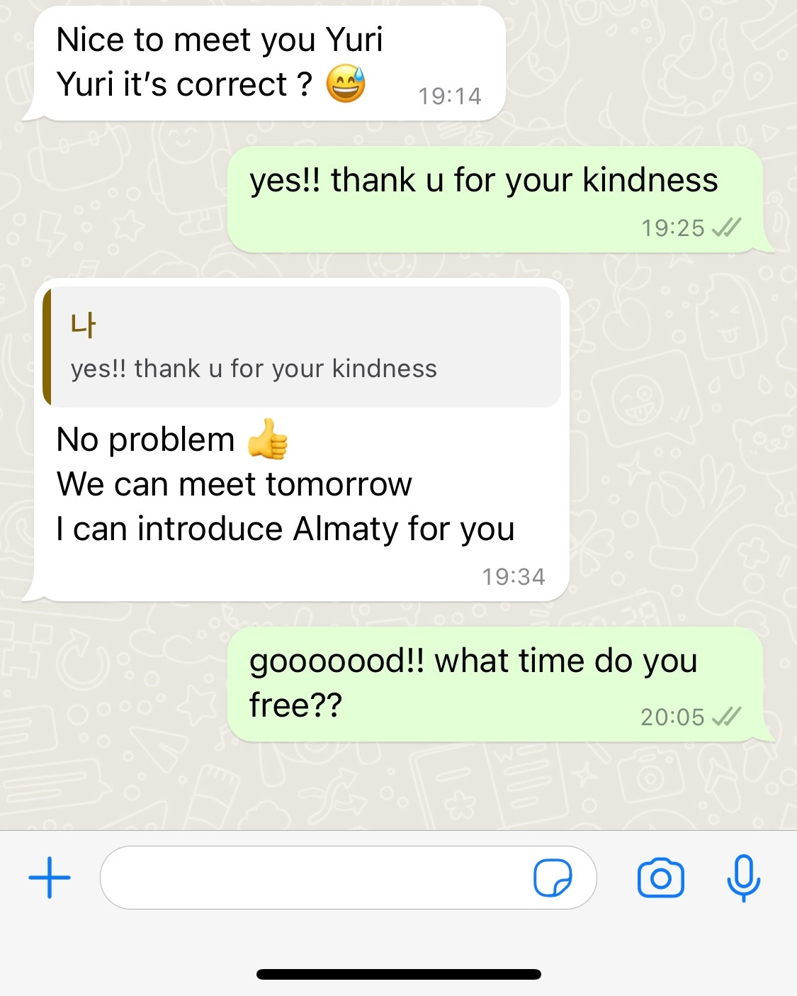카자흐스탄에서 쓰는 매신저 앱은 왓츠앱 이다. 호다닥 깔아서 내일 약속 간 정하는 중 ....!