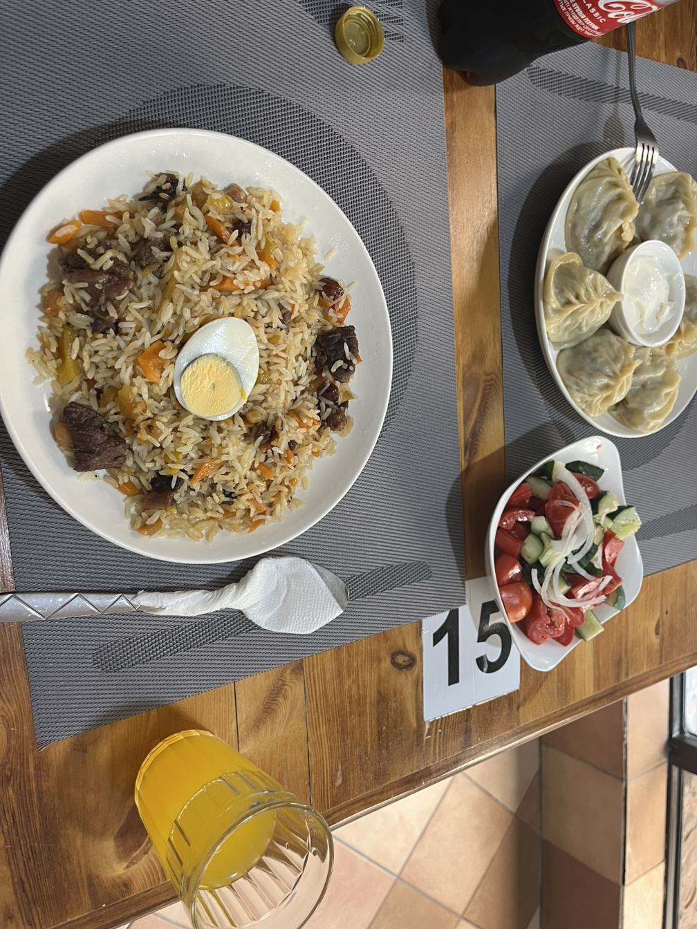 내가 시킨건 카자흐스탄 사람들이 자주 먹는 대표음식같은것이고, 고기는 소고기다. 밥알이 따로 놀아서 씹는데 힘들었지만 너무 배고파서 싹싹 비웠다. 그 사람은 만두같은걸 시켰는데 저기 중간에 하얀게 뭐냐 물으니 달지 않은 요거트를 발라서 저렇게 먹는게 카자흐스탄에서는 보편적이란다. 그리고 저 오이랑 토마토 셀러드는(이름을 두번이나 물었지만 까먹음.) 여름에 먹는 별미 같은거란다. 특별한 소스는 없고 딱 내가 좋아하는 맛! 상쾌하고 맛있었다.
