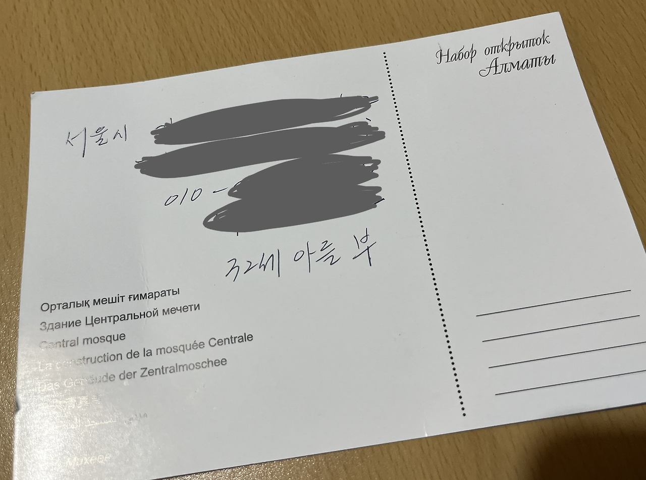 여기도 있을까? 싶어 옆 가게에 가서 엽서가 있냐 물으니 이 곳에서는 12장 묶음에 2500텡게(7500원정도) 였다. 이런!! 여길 먼저 왔어야 했는데 !! 약간 후회를 하며 엽서 한 뭉치를 또 샀다. 남은 시간, 이 엽서에 사랑하는 사람들을 향한 마음을 담아 편지를 쓸 생각이었다.