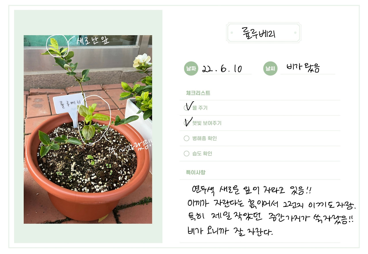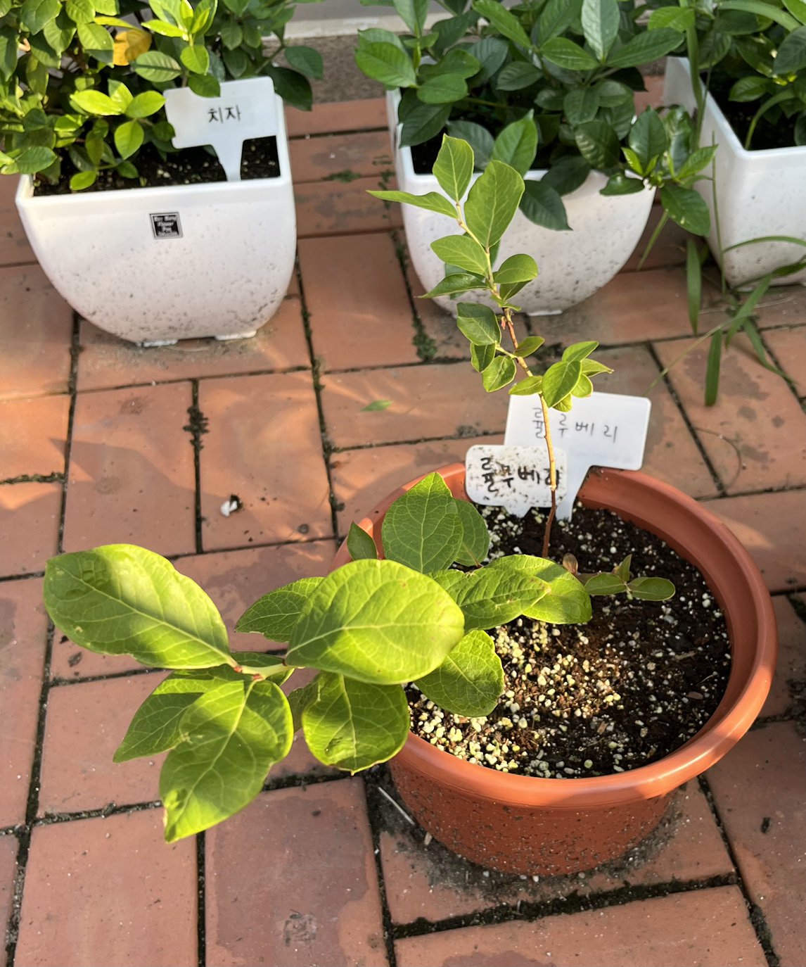 여름 사이 장맛비를 맞더니 처음 분양 받아왔을 때 보다 훌쩍 컸다. 급식실에서 나오면 화단이 길게 늘어져 있는데 그곳에 갖다 놓고 키운다. 다른 선생님들이 이름표를 보시고는 이 나무 품종 이름이 률루베리인 줄 아신다. 가끔 그런 이야기를 엿들을 때면 본의 아니게 잘못된 정보를 전달하는 것 같아 조금 미안한 마음이 들기도 하지만, 잘 지은 이름이라 생각한다.