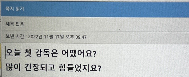 나와 단짝 친구로 지내는 다른 신규선생님도 이번이 첫 수능 감독이었다. 단 둘이 발령을 받아서 일주일에 7번 보는 사이로 지내고 있다. 이 친구도 수능 감독이 끝나고 그 날 저녁, 부서 부장님께 뭉클 한 쪽지를 받았다며 내게 사진을 보여주었다. 왜 이렇게 다들 따뜻하신건지... ㅠㅠ
