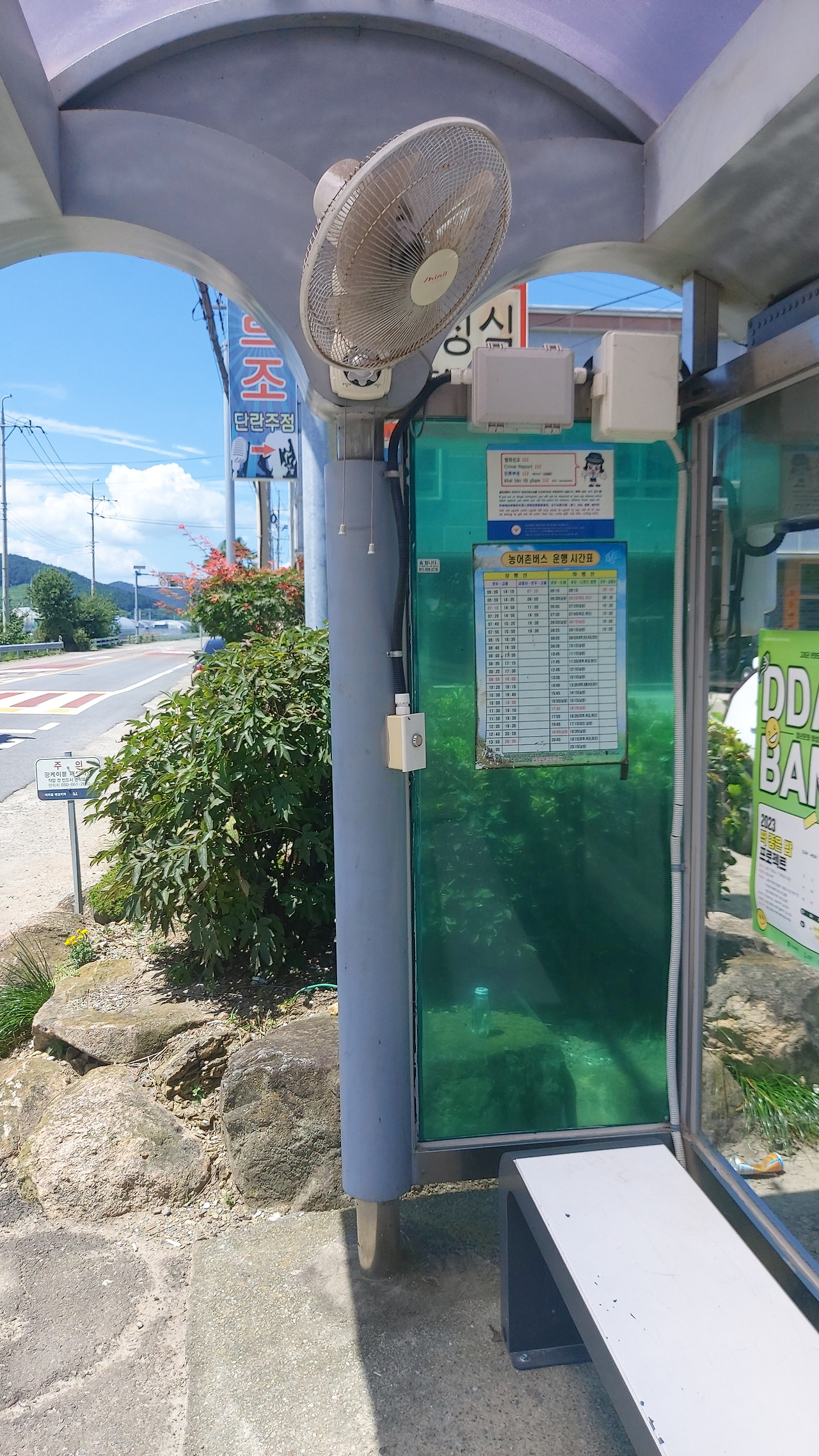 여름이라 햇볕이 뜨겁다. 살짝 괴로워질 정도로 기다렸지만 버스는 도통 올 생각이 없다. 손부채질을 하다 문득 고령자들은 어떻게 버스를 타고 다니는 건지 오지랖이 생긴다. 병원, 마트, 목욕탕 등 모두 읍에 집중되어 있는데, 운전도 못할 나이가 된 어르신들은 이런 힘겨운 길을 매번 감내하고 있는 걸까? 낯설게도 정류장 한구석에 선풍기가 매달려있다. 먼지가 한가득 쌓여있어 오랫동안 사용되지 않았음을 예감한다. 불현듯 선풍기처럼 낡아 있는 버스시간표가 과연 맞을까, 때늦은 고민도 꼬리를 물고 떠오른다.