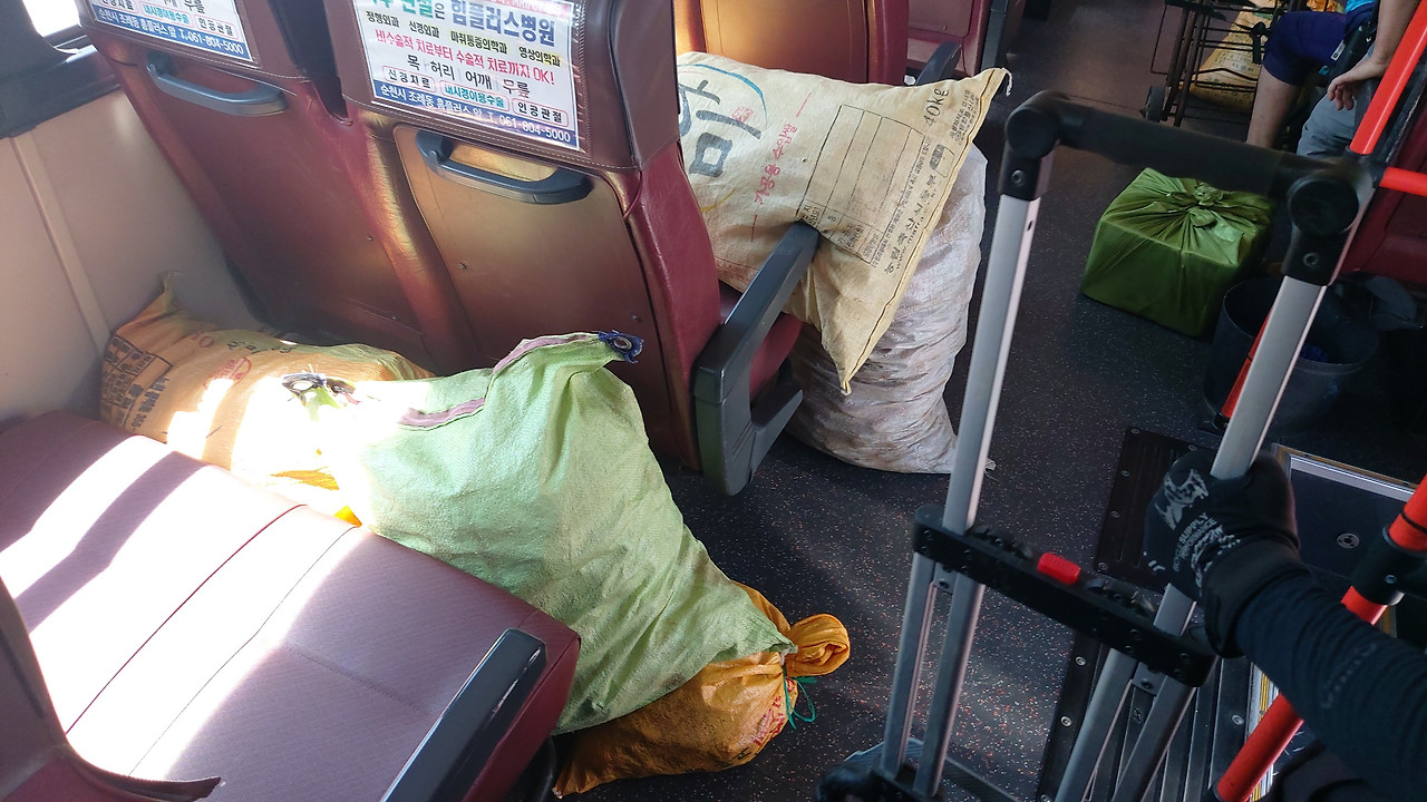 중고등학교도 읍에 몰려있는지라 정류장마다 학생들이 계속 올라탄다. 선후배 사이들이라 제법 깍듯하다. 어르신들도 계속 탄다. 간단한 인사말, 근황 소식들이 오간다. 어떤 노부부는 마대자루에다가 말린 고추를 한가득 담아 버스에 올랐다. 버스정류장은 ‘길두’, ‘호형’, ‘장수’처럼 마을이름을 차용하다 보니, 뒤에서 보고 있노라면 여기는 이쪽 마을 사람, 저기는 저쪽 마을 사람 등등 모여 다 같이 고흥읍으로 나가고 있는 모양새다. 이곳은 ‘만남의 광장’, 아니 ‘만남의 버스’다.