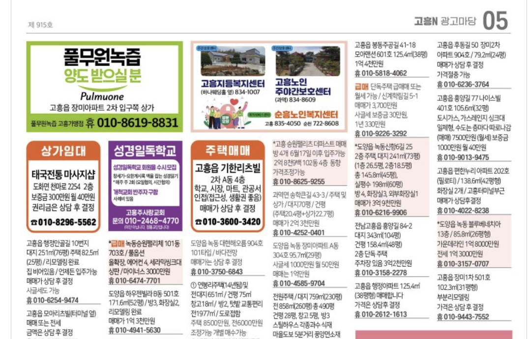 일단 예상보다 집값이 비쌌다. 월세가 40만 원 밑으로 내려가면, 십중팔구 멘탈 관리가 여기서 과연 될까 하는 집들을 보게 됐다. 이런 집은 애초에 ‘연세’를 받기도 했는데, 원래 주거공간이 아닌 곳을 주거공간처럼 쓰는 곳, 기름보일러를 때야 하는 곳, 도배장판을 입주자가 해야 하는 곳 따위였다. 집주인들은 매물을 열심히 홍보하는 편이다. 여러모로 영 쉽지 않은 방들을 돌려야 하니까 말이다. ‘고흥엔’이라는 군소식지에 구인, 구직, 주택매매, 임대 등과 관련된 웬만한 정보가 망라되어 있었고, 나도 여길 보고 집주인과 직접 계약할 수 있었다.