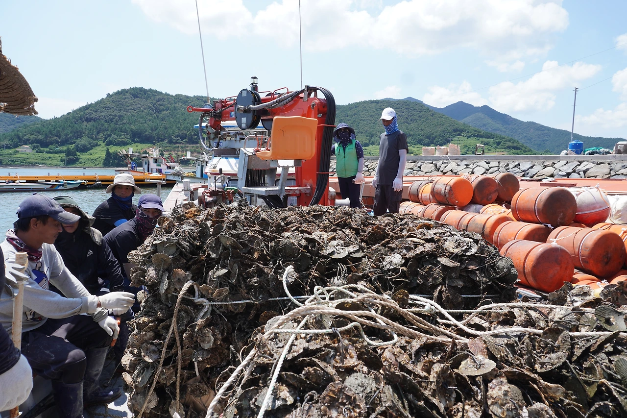 오전 열한 시, 이장님 빠지에 도착했다. 오늘 할 작업은 ‘수하연’을 매다는 것이다. 오취마을의 굴양식은 ‘연승수하식’이라는 이름을 가지고 있다. 방식은 이렇다. 수심 6m가 넘는 바다에 부표들을 띄우고 바닥부터 연결된 ‘모릿줄’이라 하는 굵은 동아줄을 두 줄 걸어놓는다. 그럼 그 줄이 해수면에서 하늘하늘 떠다니는데, 그 줄에 일정간격으로 약 2m 길이의 또 다른 줄들을 달아 늘어뜨린다. 바로 이 줄이 수하연이다. 수하연에는 굴 종묘가 부착된 가리비 패각이 20cm 간격으로 달려있고, 바로 이 패각, ‘채묘기’에서 굴들이 양식된다.