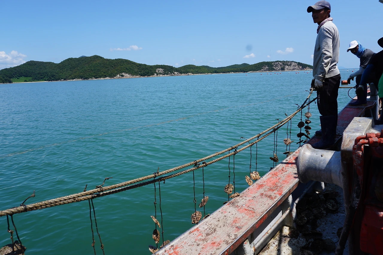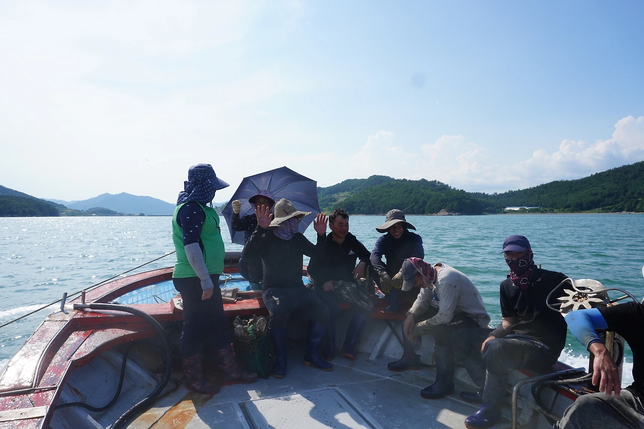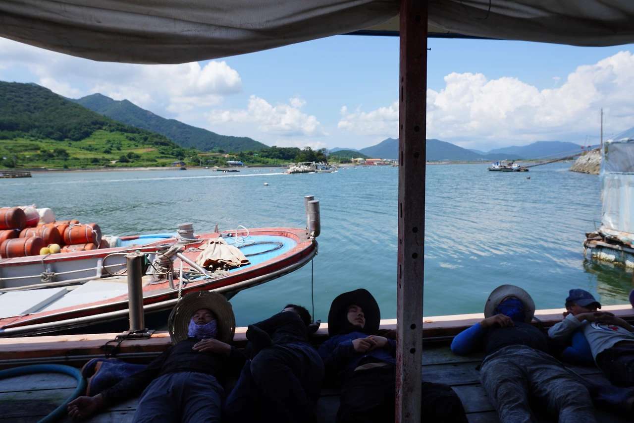 작업복 차림에 모자로 얼굴을 가리고, 일렬로 누워 있는 그들의 머리 위로 파란 바다와 하늘이 넘실거린다. 수하연에 부착된 굴이 죽는 건 아닐까 싶을 정도로 강한 햇볕이 내리쬐고 있었지만, 빠지 위에 설치된 그늘막 안은 무척 시원하다. 곧 닥칠 힘든 뱃일을 대비하려는 것처럼, 몸을 정지시킨 근로자들의 침묵이 파도소리 위에 덧입혀진다. 적막은 결코 아니다. 물이 흔들리는 소리가 일정하다. 이장님 아내 분과 이장님 친구의 아내 분께선 도란도란 이야기를 나누시고, 바람소리와 이따금 갈매기 소리가 들려온다.