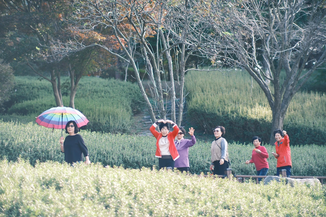 (좌) 안면도자연휴양림을 걸으시는 마을 주민들과 (우) 얼이 빠진 담당실무자 버들의 모습이다.