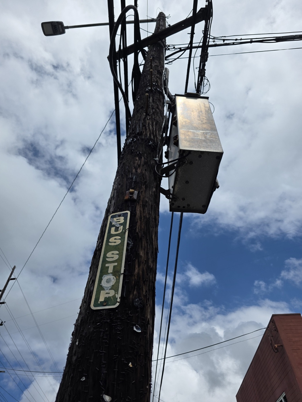 생전 처음 본 나무전봇대. 자세히 보면 타카 심이 빼곡히 박혀있다. ‘브레이킹 배드 시즌2’ 초반부, 마약상에게 (역시 마약을 제조하는) 주인공 일행이 납치되는데, 그 걸 알 턱 없던 가족들은 그를 수소문하기 위해 나무전봇대에다가 타카로 전단지를 박는다. 전봇대 관리는... 안 되는 게 당연하려나. 버스정류장 표시가 달려있지만... 이곳은 정차하는 곳이 아니었다.