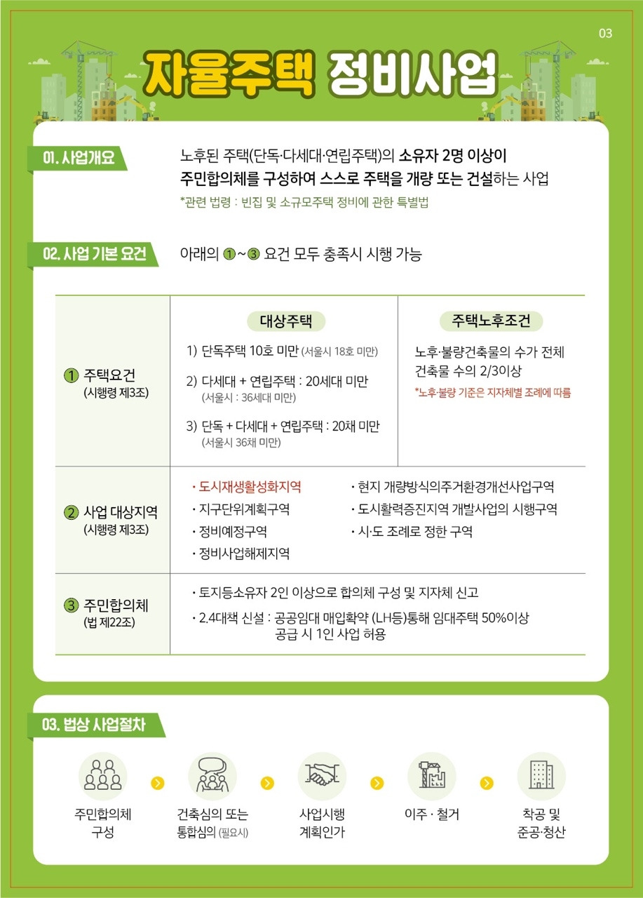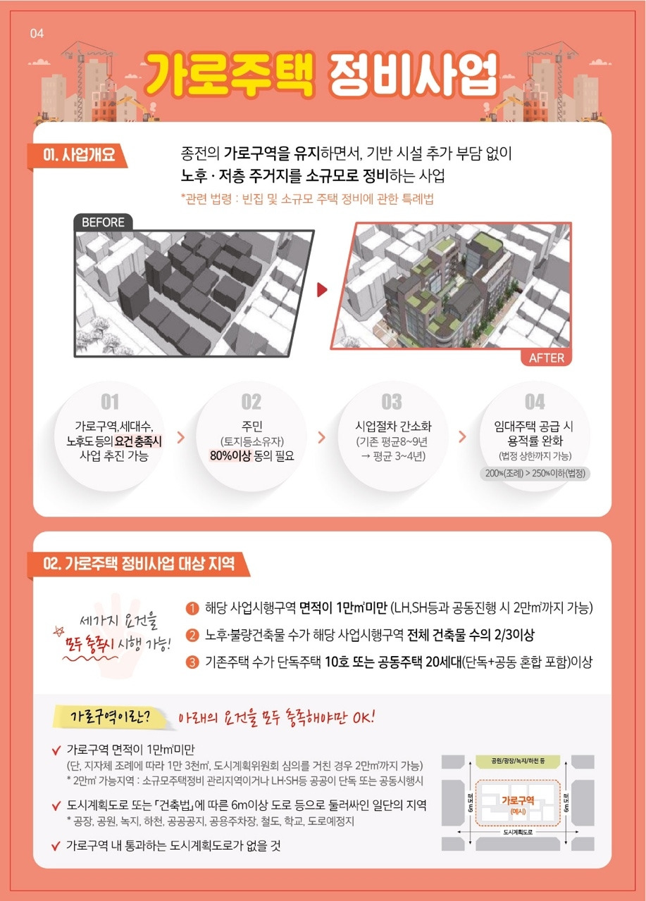 많은 이들이 모르겠지만, 문재인 정부는 주택을 공급하기 위해 다양한 정책들을 정비한 바 있다. 국가가 개입하여 공정에 안전성을 담보하는 대신, 공공의 포션을 최대한 가져가겠다는 기조였기에, 필연적으로 국가의 과도한 시장개입이라는 비난을 감내해야 했다. 쪽방촌 주민들을 재정착 시키기 위해 공공임대비율을 절반도 넘게 가져가려 했던 ‘용산 동자동 공공 재개발’이 대표적이다. ‘소규모주택정비사업’도 같은 맥락에 있었다. 주요 특징을 알기 쉽게 정리하면 다음과 같다.