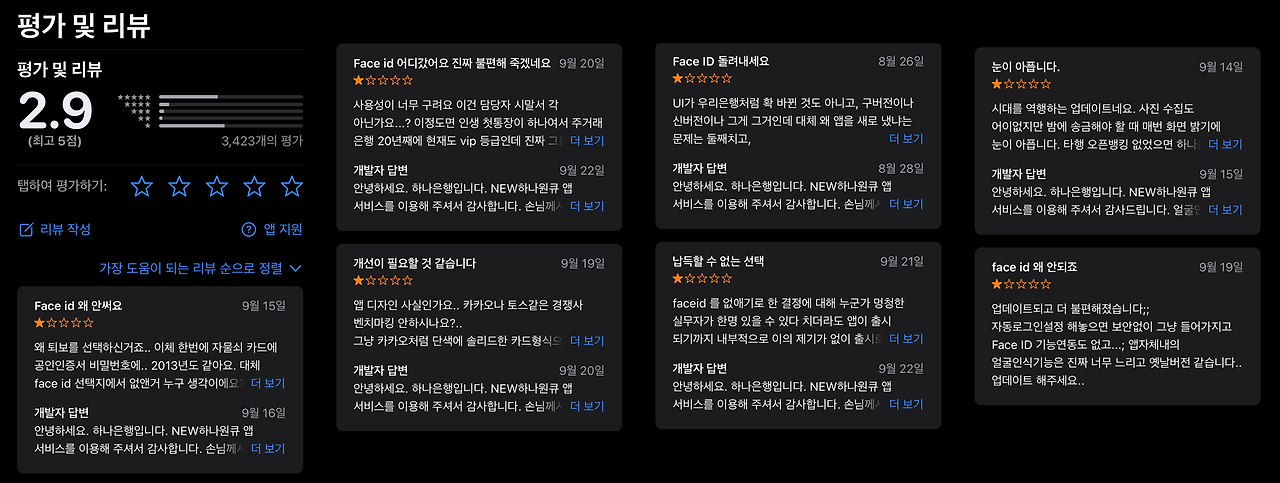 새로운 'NEW 하나원큐'앱도 출시되자마자 문제가 있었는데, 그것이 바로 생체인식이 아닌 하나은행이 지원하는 스타트업의 '얼굴인식' 기능을 넣은 것. 넣은거야 뭐 그럴 수 있다. 하지만 약관에 '학습용'으로 사용된다는 고지를 안했던 것, '필수' 동의 조항이었던 것이 문제였다. 이후 개선을 하면서 별도의 선택 약관으로 넣었지만- 물론 나는 동의하지 않음 왜 이런 기술을 꼭 자체의 기술로 하려는 것인지, '디지털'이란 무엇인지 생각해봤으면 한다. 위 기사에서 우리나라의 디지털경쟁력이 8위라고는 하지만, 기사에서 언급한 '은행과 금융 서비스(49위)'라는 부분을 잘 생각해봤으면. 새로운 'NEW 하나원큐'앱은, 잠시 만져본 것 뿐이지만, 그들의 생각은 '디지털'과 아직 멀은 듯 하다.