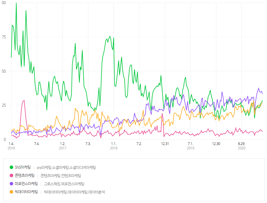 마케팅도 당연히, 매일 하는 것이다 보니 유행이 생기고, 유행이 저물기도 한다. 아래 그래프는 네이버 데이터랩에서 2016년 이후 디지털 마케팅에 있어 한때 유행처럼 생겼던 것들을 키워드로 묶어 검색 변화를 살펴본 내용이다.