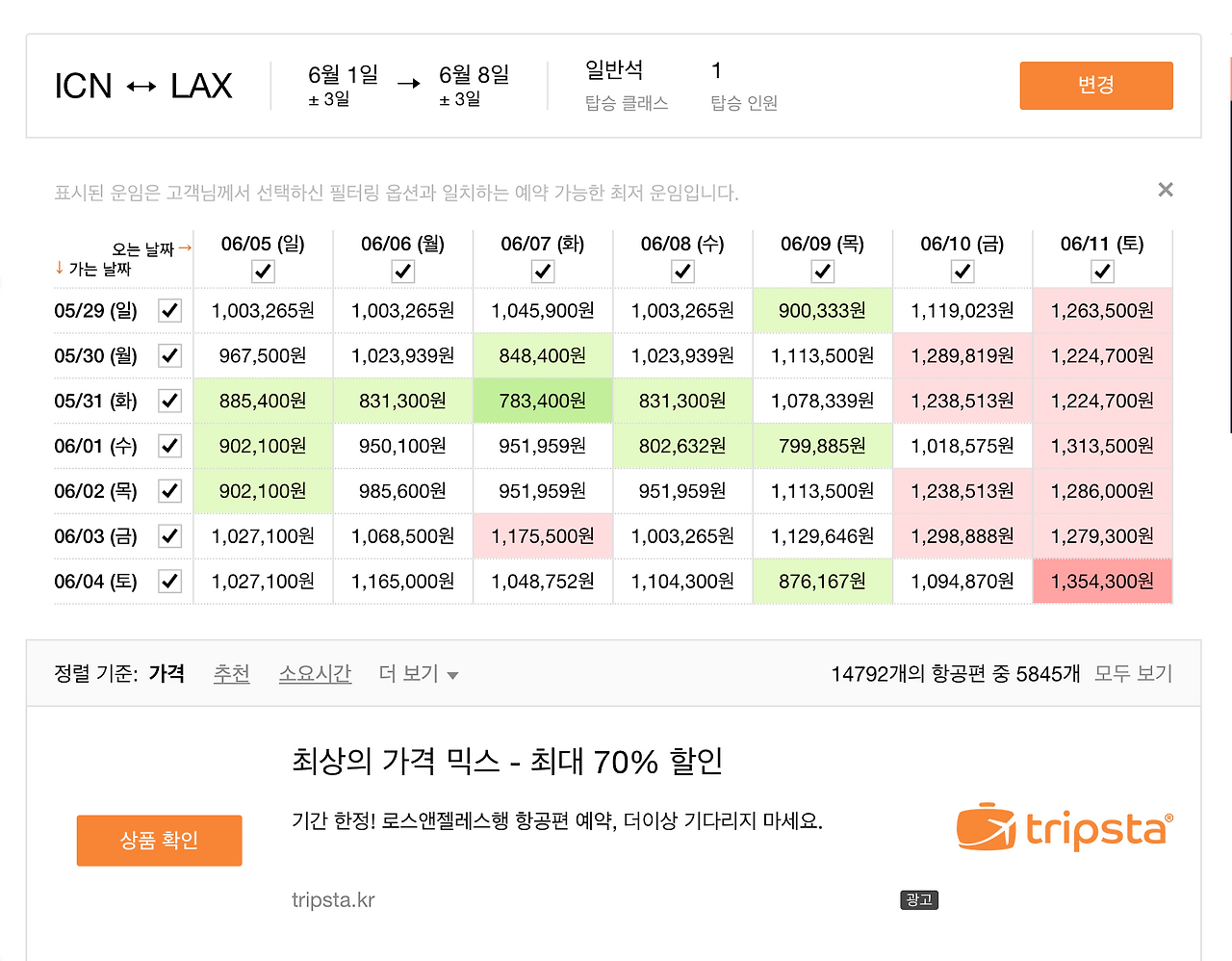 하단에 정확한 날짜, ±3일, 주말 창이 추가되었어요. 여기서, ±3일을 눌러보고 전후 3일로 검색을 하면 아래와 같은 표가 나오게 됩니다. 일종의 Matrix 검색인 거죠.