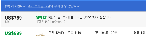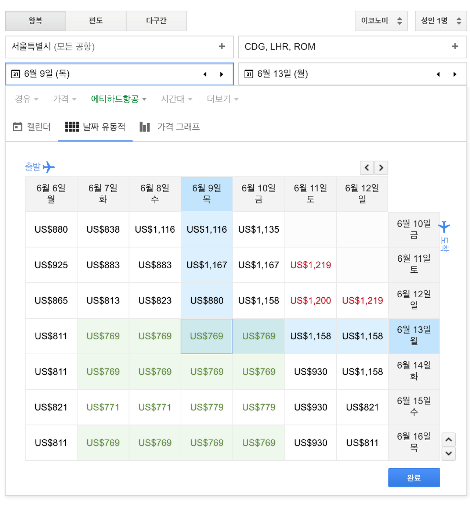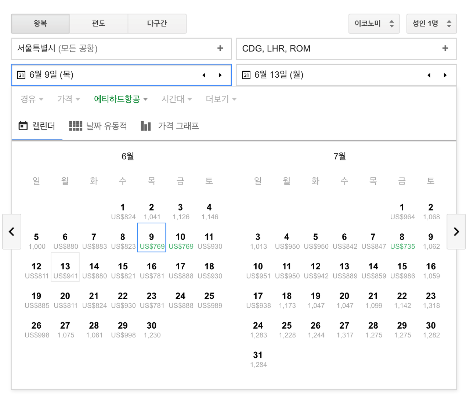 이렇게 되면 조금 더 싼 가격의 항공권을 빠르게 찾을 수 있습니다. 돌아오는 날짜를 하루 지연해서 6/9일에 돌아온다면, 가격은 이 검색에서는 차이가 별로 없지만 799,855원이 되겠네요. 위 표를 본다면, 정말 날짜별로 변동폭이 큽니다. 그만큼 항공권은 날짜에 민감하다고 볼 수 있죠.