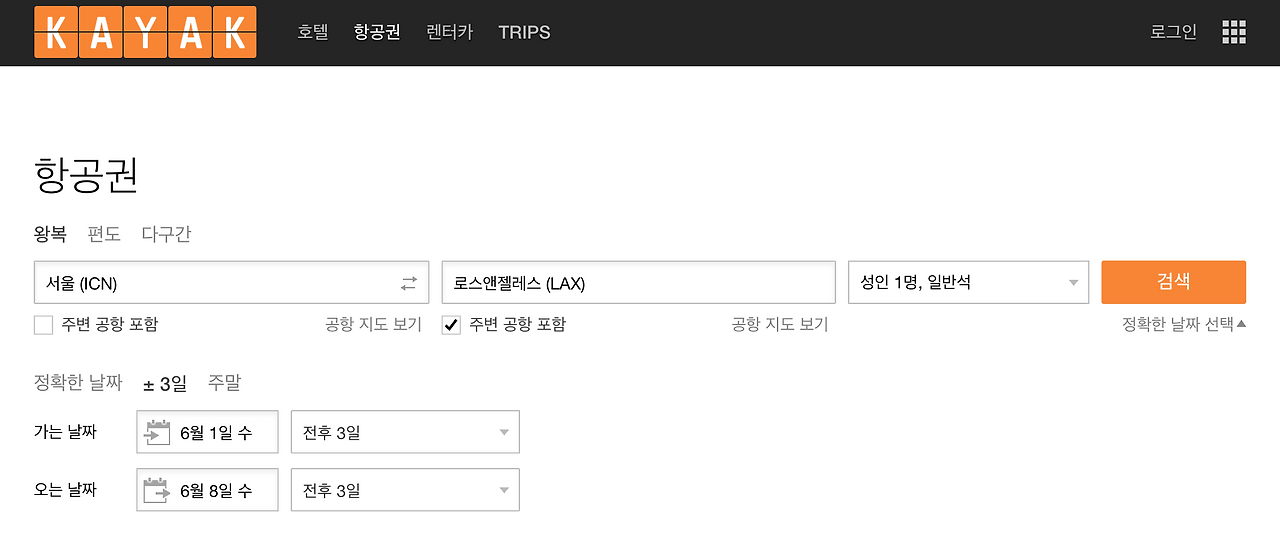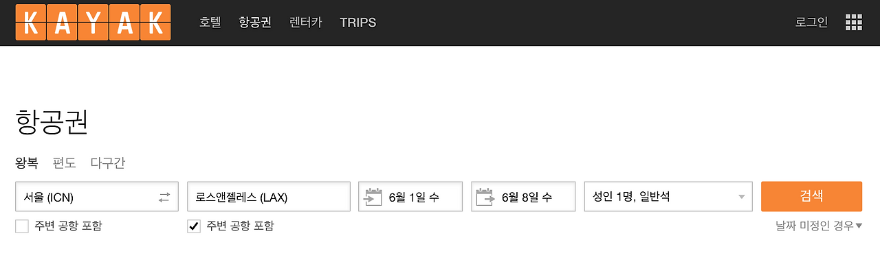 카약을 들어가면 바로 나오는 화면은 [그림 1]과 같습니다. 6/1 ~ 6/8까지 ICN-LAX 구간을 검색하려 합니다. 근데, 그 전에 오른쪽 검색 버튼 하단에 날짜 미정인 경우라는 글씨가 보이네요? 한번 클릭해보죠.