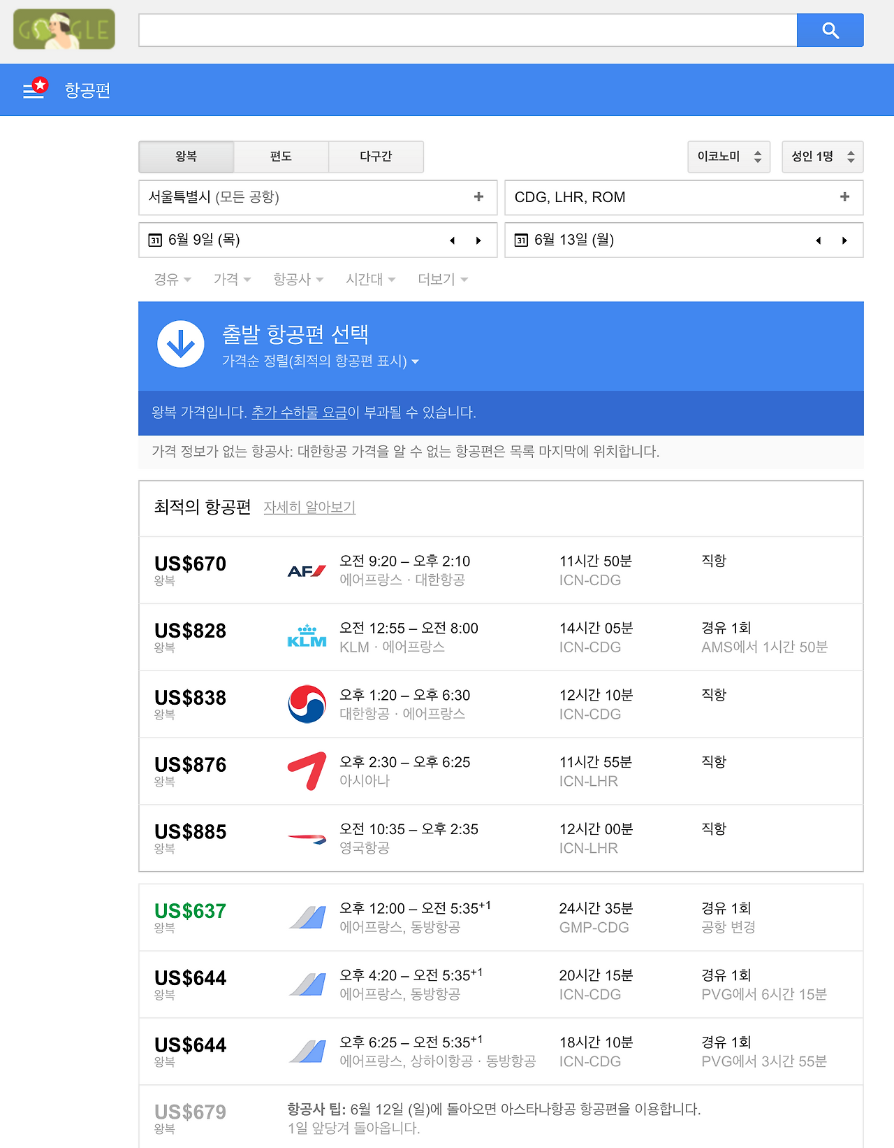 1. 한 번에 여러 목적지를 검색할 수 있습니다. 예를 들자면, [그림 5]처럼 목적지에 CDG(파리-샤를 드골 공항), LHR(런던-히드로 공항), FCO(로마-피우미치노 공항)와 같이 입력해서 최대 5곳까지 한 번에 같이 검색할 수 있어요.