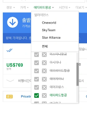 2. Kayak이나 SkyScanner처럼 전체 검색 후 항공사 필터링으로 원하는 항공사를 검색하는 게 아니라, 검색 단계부터 항공사를 지정해서 검색이 가능합니다. 국적기만 계속해서 검색하고 싶은데, Kayak과 SkyScanner에서 모든 항공사를 매번 다 검색하고 항공사 필터링을 해서 느렸던 문제가 깔끔하게 해결됩니다.
