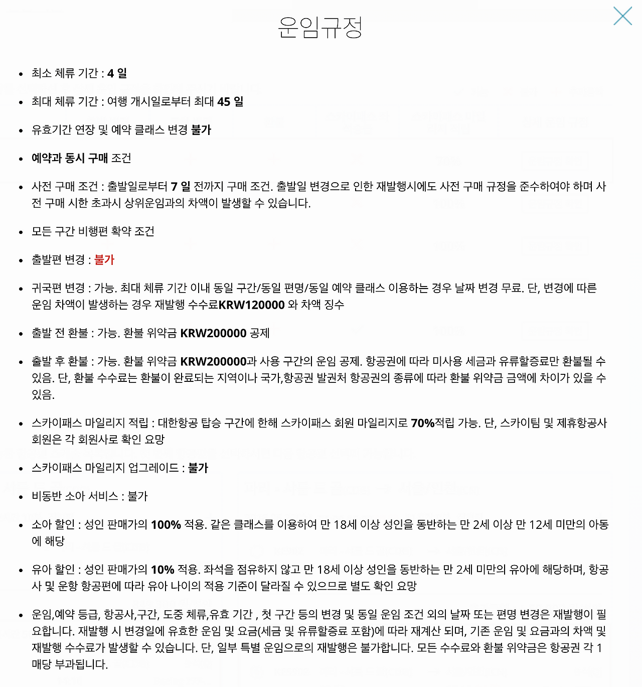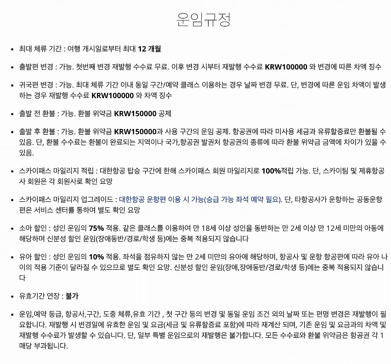 뭔가 많이 바뀌었습니다. 일단 최대 체류기간이 45일->12개월로 늘어났습니다. 구매한 항공권이 출발 후 12개월 동안 유효한다는 것이죠. 혹시 비행기를 놓쳐도 12개월 안쪽이면 변경 수수료를 지불하고 항공편을 변경할 수 있다는 뜻입니다. 출발 편/귀국 편 변경도 특정 조건에 한해서 무료로 바뀌었습니다. 특히 출발 편은 불가였는데 무료로 바뀌어서, 잘못 구매했을 경우 변경이 불가능하니 취소수수료를 물고 다시 발권해야 하는 번거로움이 줄었죠. 마일리지 적립도 100%로 상승했고, 마일리지를 활용한 좌석 업그레이드도 가능해졌습니다. 근데, 80만 원의 약 2.65배나 주면서 타야 할까요? 선택은 본인 몫이겠지만 제가 티켓을 구매할 때 일정을 확정 지을 수만 있다면 아주 저렴한 티켓을 선택할 것 같네요. 마일리지는 사실 돈으로 환산하면 얼마 차이 나지 않기 때문이죠.