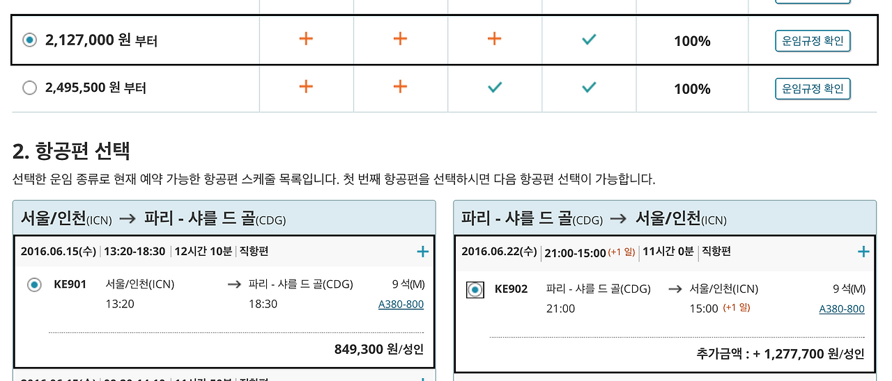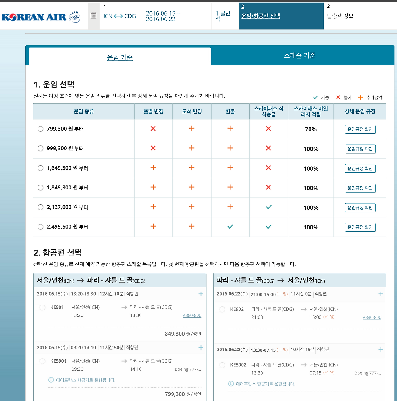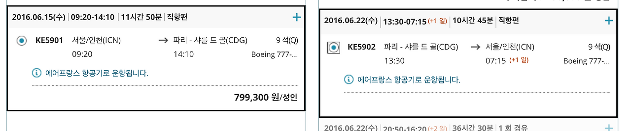 6/15-6/22까지의 대한항공 인천-파리 왕복 항공권을 검색했습니다. 근데 보아하니 운임이 여러 개네요? 일단 가장 싼 799,300원짜리를 선택하고, 아래의 해당 금액에 해당하는 항공편인 KE5901, KE5902 항공편도 선택해봅시다.