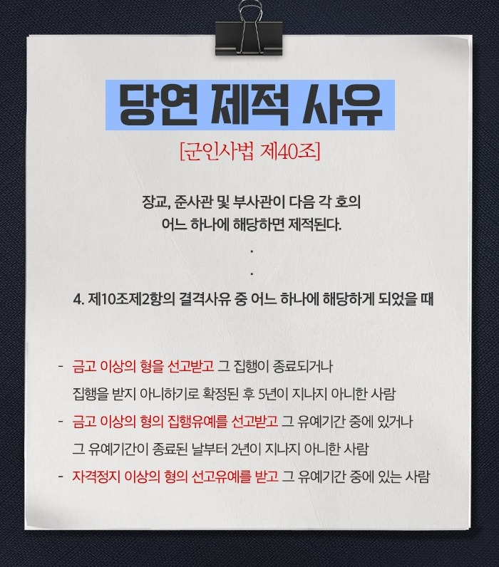 결론적으로 본 사안에 대해 혐의가 명백한 사안일 경우, 반드시 집행유예에 그치고 별도의 군징계나 당연 제적 사유에 해당되지 않도록 적극적인 방어가 우선됩니다. 그러나 이는 일반 형법이 아닌 군형법의 적용을 받죠.