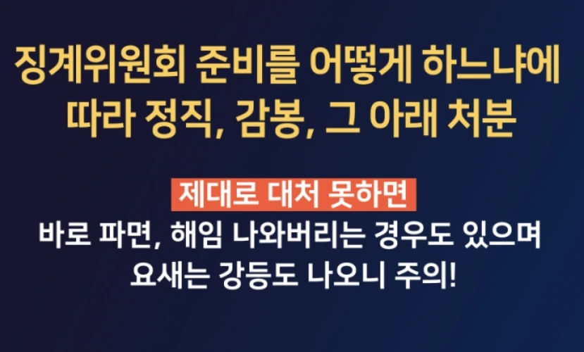 그런데 징계위원회 준비를 어떻게 하느냐에 따라서 정직이나 감봉 처분이 나오기도 하고 제대로 대처 못하면 바로 파면, 해임 나와버리는 경우도 있습니다.