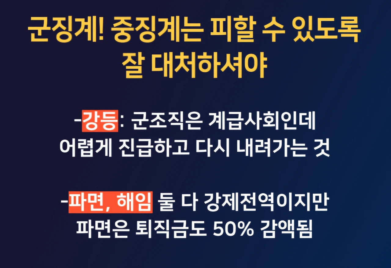 군인 징계의 종류는 크게 중징계와 경징계로 구분할 수 있습니다. 왜 중징계를 피해야 되는지, 중징계의 불이익 등에 대하여 설명 드리겠습니다.