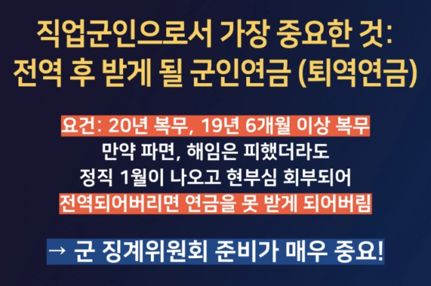 직업군인으로서 10년 넘게 근무하면 가장 중요한 것은 전역 후에 받게 될 군인연금, 보다 정확하게 퇴역연금일 것입니다. 그런데 그 요건이20년 복무, 19년 6개월 이상 복무인데, 만약 지금 18년, 19년 가까이 복무한 상황이라 조금만 더 있으면 연금수급권이 생길 수 있는데 징계위원회에 회부되었습니다. 파면, 해임은 피했더라도 정직 1월이 나오고 현부심 회부되어 전역되면 연금을 못 받게 되어버립니다.