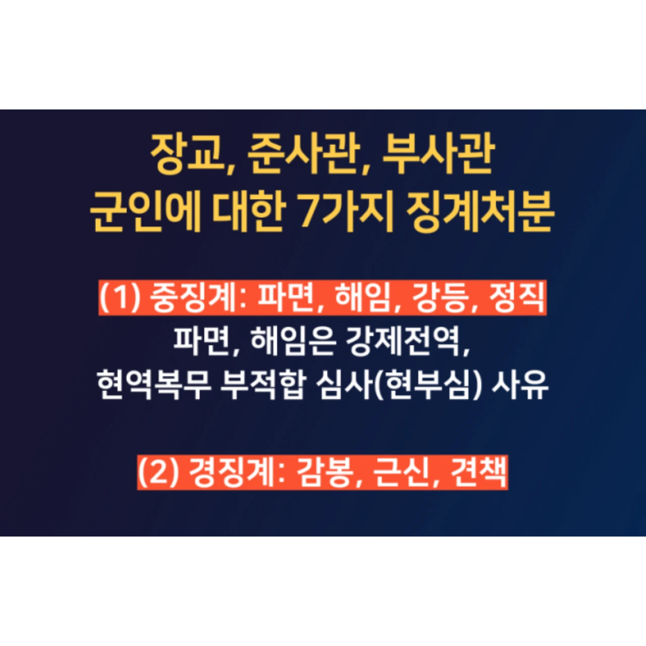 장교, 준사관, 부사관과 같은 군인에 대한 징계처분은 파면, 해임, 강등, 정직, 감봉, 근신, 견책 이렇게 7가지가 있는데, 파면, 해임, 강등, 정직이 중징계이고, 감봉, 근신, 견책이 경징계입니다.