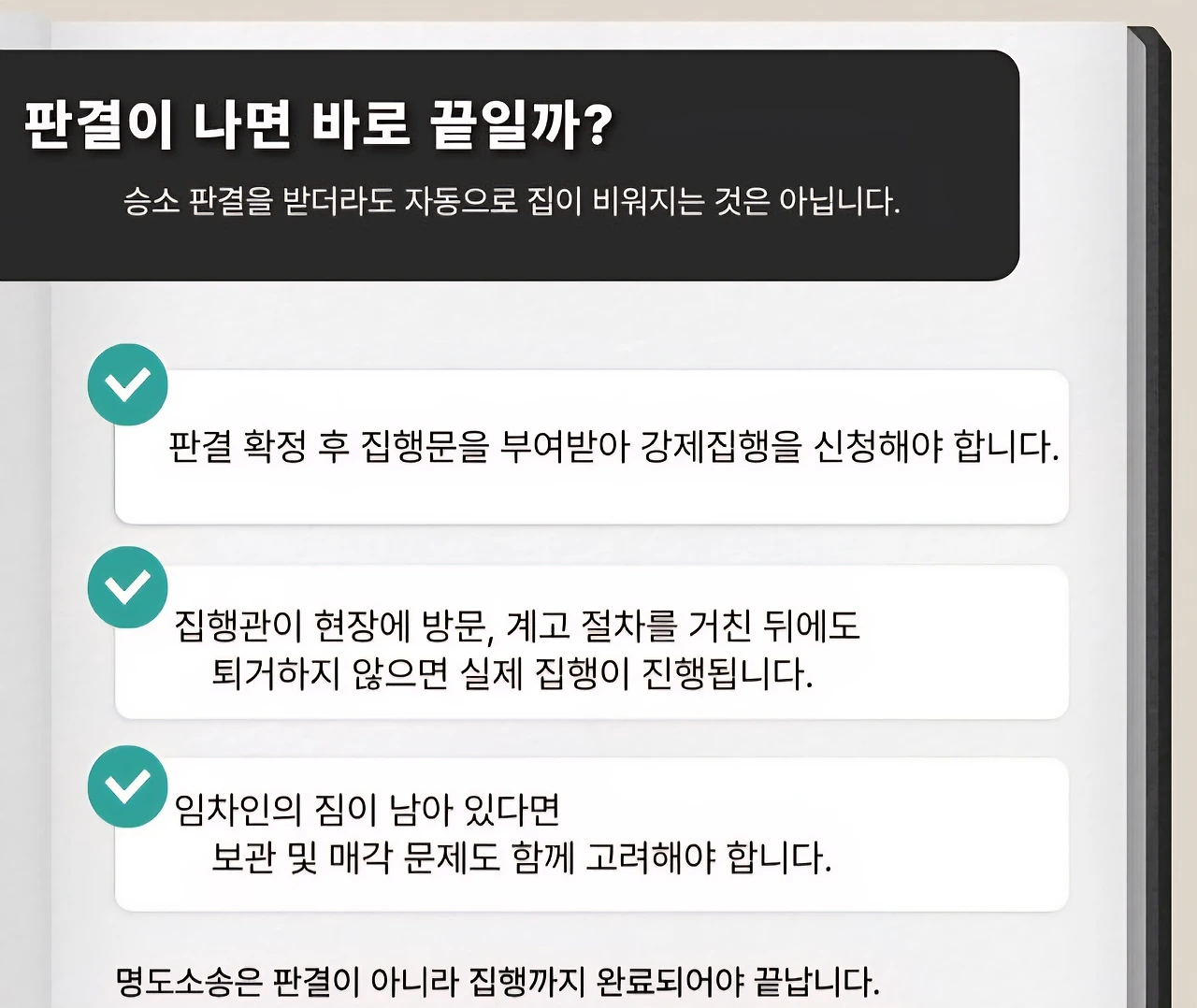 명도소송의 목적은 판결문을 받는 것이 아니라 실제로 건물을 인도받는 것입니다.