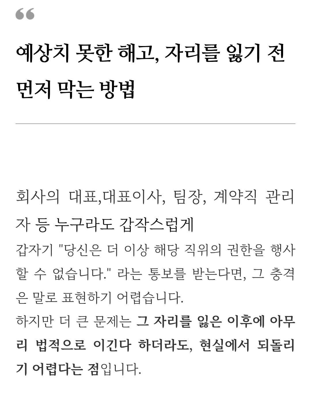 이처럼 일반 직원이나 중간관리자도자신의 지위가 일방적으로 침해됐다고 판단되면 법적으로 대응할 수 있는 길이 있는 것입니다.