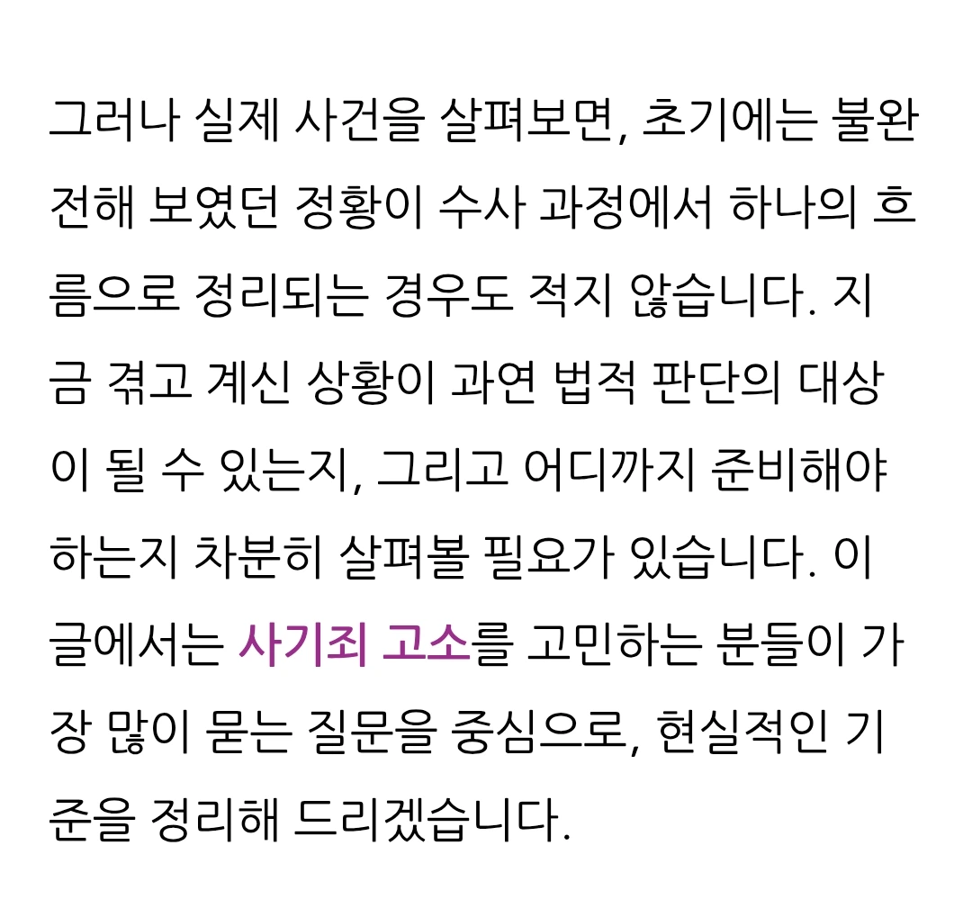 이런 요소들은 ‘기망’ 판단에 영향을 줍니다. 단순 분쟁인지, 형사 판단의 영역인지 경계선에 있는 사안일수록 정리 방식이 결과를 좌우합니다. 이때 서울 신당동 사기죄 변호사와 상담을 진행하면, 현재 상황이 어느 쪽에 가까운지 보다 객관적으로 짚어볼 수 있습니다.