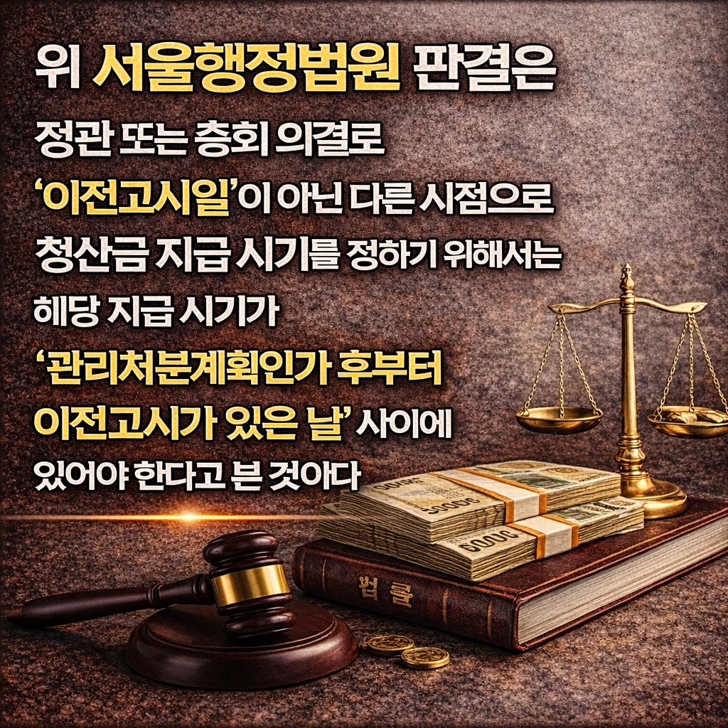즉, 위 서울행정법원 판결은 정관 또는 총회 의결로 ‘이전고시일’이 아닌 다른 시점으로 청산금 지급 시기를 정하기 위해서는 해당 지급 시기가 ‘관리처분계획인가 후부터 이전고시가 있은 날’ 사이에 있어야 한다고 본 것이다.