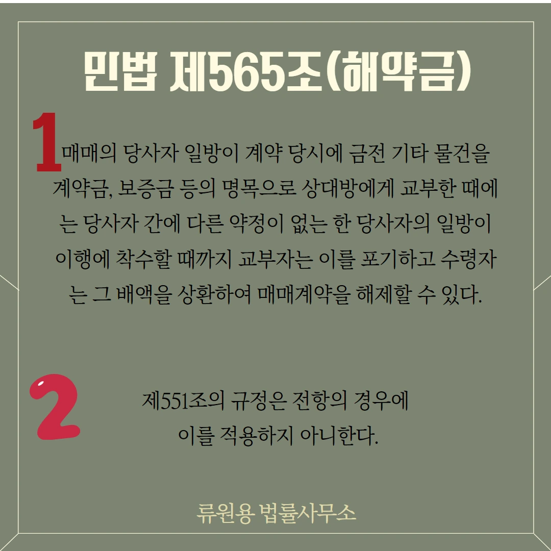 이처럼 부동산계약의 당사자 중 일방이 임의로 계약을 해지하면 민법 제565조에 따라 매도인은 수령한 계약금의 배액을 매수인은 지급했던 계약금을 포기하면서 이를 해약금으로써 상대방 손