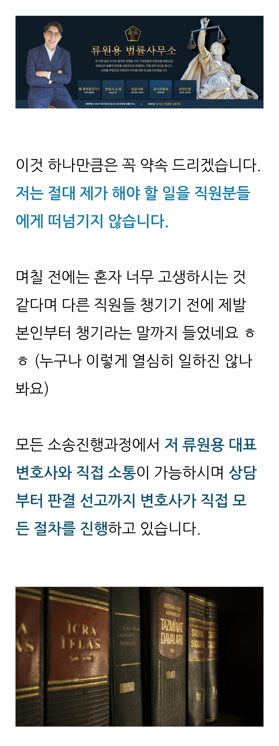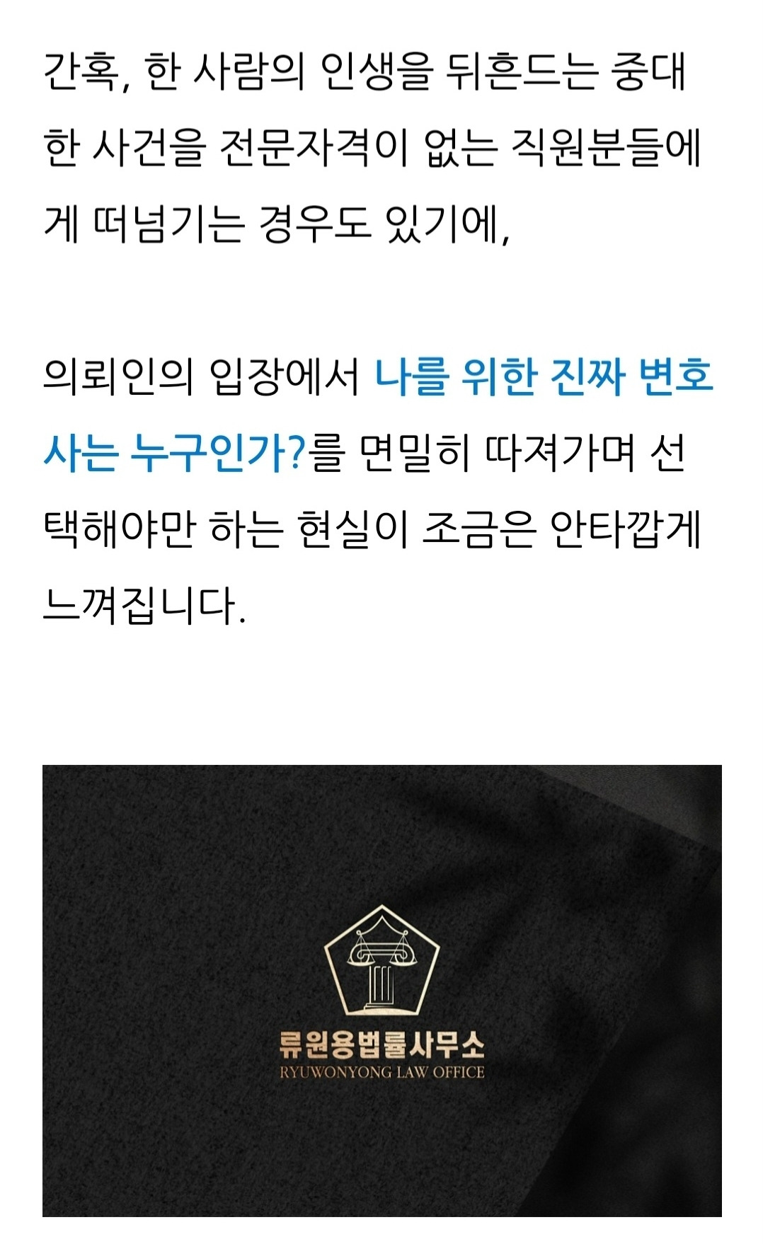 류원용 법률사무소는 의뢰인의 사건에 맞춰 1:1 서비스로 상담 및 사건 진행을 책임지고 진행합니다. 군에 관한 재판 지식을 겸비한 류원용 대표 변호사가 직접 조력하며 직업군인 음주 사건으로 인한 면허 취소 사건과 관련하여 형사절차 군징계 절차 행정 심판 등의 대한 조력이 필요하시면 언제든지 연락 주시기 바랍니다
