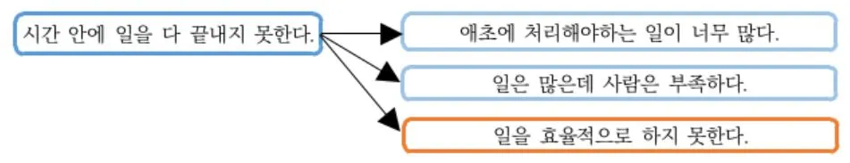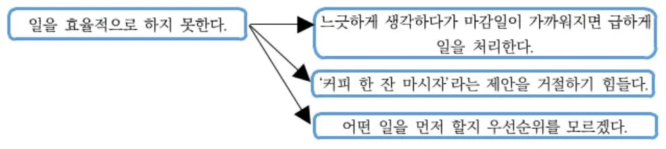이 중 첫 번째는 우리가 바뀐다고 해서 상사의 마음까지 바꾸기는 힘들 것이다. 반면에 두 번째는 우리가 변화한다면 충분히 통제할 수 있는 부분이다. 그렇다면, 왜 일을 다 끝내지 못하는지 세부적으로 생각해보자.