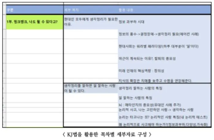 위의 사진은 본인이 글을 쓸 때, 목차(제목)에 따른 참고자료들을 정리한 화면이다. 액셀을 활용한 KJ법에서는 카드를 셀이라고 생각하면 된다. 수집한 정보들을 종류에 따라 셀 하나하나에 적고, 각 셀들을 조금 큰 범주의 주제로 묶어낸다. 그렇게 하면 수많은 정보들도 손쉽게 정리해낼 수 있다. 액셀 프로그램은 중간에 셀을 삽입하기도 쉬우므로 실시간 편집도 가능하다.