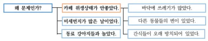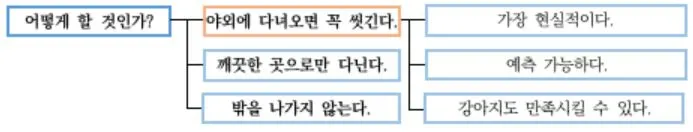 결국 야외에 다녀오면 무조건 씻겨주는 방법을 찾아냈다. 물론 이것이 최선의 방법이 아닐 수도 있다. 그러나 로직트리를 활용하면 무엇이 문제인 지부터 어떻게 해결할 것인지까지를 자연스럽게 생각해볼 수 있다.