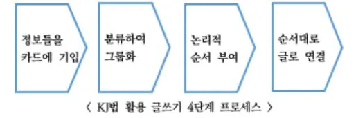 KJ법은 정리해야 하는 정보가 수도 없이 많을 때 쉽게 정리할 수 있도록 해주는 도구이다. 일본의 문화인류학자인 가와기타 지로가 만들어냈다. 본래 특정한 카드를 만들어서 사용하도록 고안된 KJ법은 다음 4단계의 과정을 통해 수행된다.