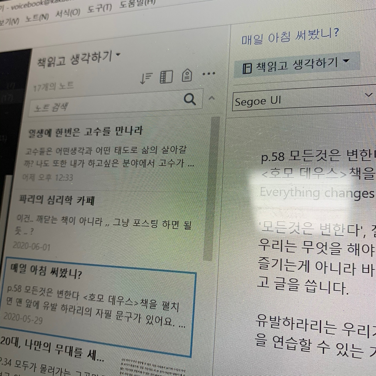 예전에 책을 읽을 때면 한 번 읽고 덮으면 끝이었다. 읽을 때는 뿌듯하고 '아! 이런 깨달음을 얻었으니 바뀌어야 해!'라는 생각을 하지만 책을 덮으면 책을 읽지 않은 것만 못하다. 그래서 나는 책을 읽을 때면 항상 좋은 구절이 나왔을 때는 따로 기록을 해둔다. 밑에다가는 나의 생각도 덧붙인다. 이러한 구절을 통해 생각이 어떻게 바뀌었는지 무엇을 다시 생각해야 하는지 등등.. 물론 이것 또한 기록해 놓고 안 보면 그만이다.