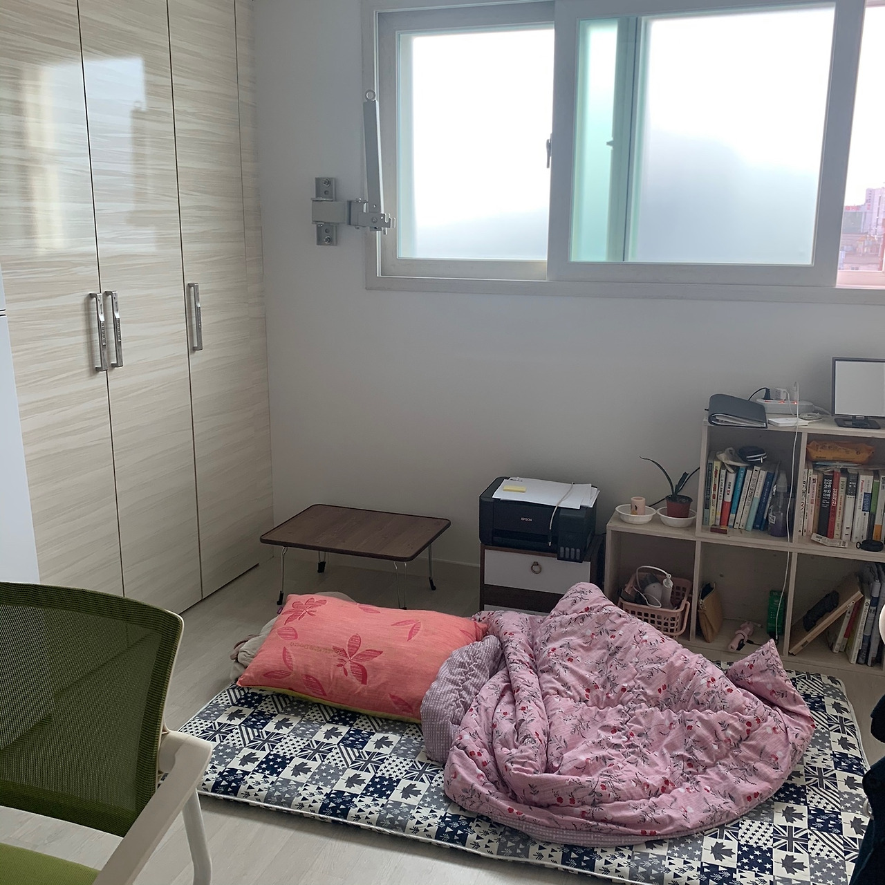 고개를 돌리면 이불을 펴야 한다. 침대를 들여놓을 자리도 없다. 침대가 있으면 빨래건조대를 놓을 자리가 없다. 아니 , 있는데 너무 비좁아서 답답하다. 정말 딱 한 명을 위한 원룸이다. 그래도 책꽂이 정도는 놓을 수 있음에 감사하다.