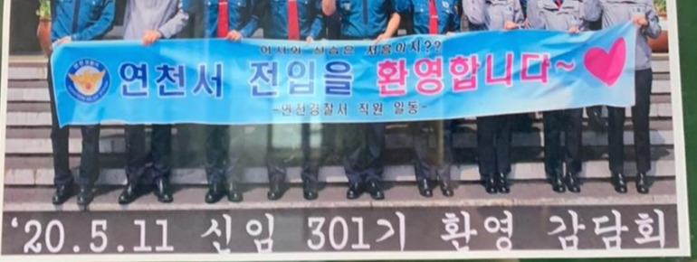 첫날은 보통 정복을 입는데 서마다 공지가 다르니 그에 따라 복장을 갖추면 된다. 가장 먼저 서장님과의 만남을 가지게 된다. 서장님과의 만남의 장소에 가면 우리 301기를 반기는 문구가 걸려있다. '어서 와 연천은 처음이지?'라는 문구와 함께 실습을 환영한다는 문구가 같이 쓰여있다.
