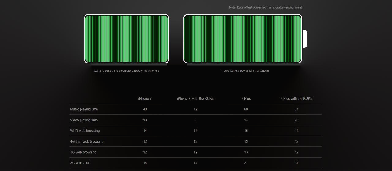 쿠너 스마트 케이스의 성능은 정상적인 출력으로 아이폰 배터리에 무리를 주지 않는 출력을 가졌고, 보조 배터리의 대해서는 무게와, 두께 그리고 용량의 타협을 잘 보았기에, 휴대성을 해치지 않는 선에서 아이폰을 위한 충분한 추가 전원 공급이 가능합니다. 여분의 무거운 보조배터리와 거추장스러운 케이블 없이 쿠너 스마트 케이스만으로 아이폰 7에서는 70%, 아이폰 7 플러스에서는 50%가량의 충전이 가능하여 넉넉한 배터리 러닝타임 확보가 가능할 것 같습니다.