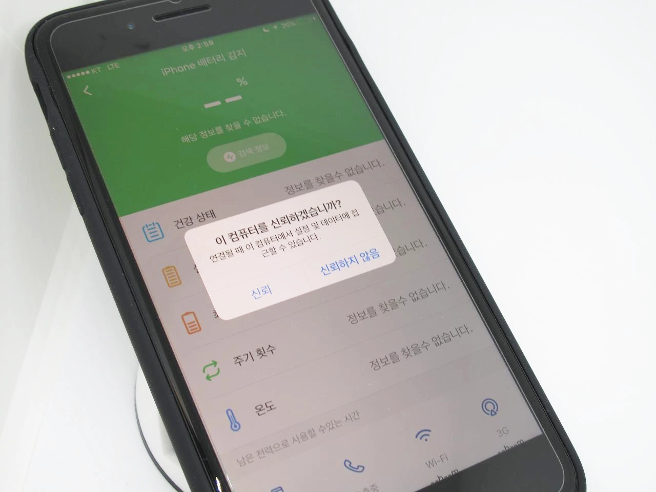 배터리 기능은 아이폰 배터리를 측정해서 사용시간을 알려주는 기능인데, 프로파일 설치가 정상적으로 진행이 되지 않아서 그런 건지는 잘 모르겠으나 측정이 되지 않는다. 안내 창이 뜨면 신뢰해준다고 몇 번이나 말했지만 정보를 찾을 수 없고 데이터를 불러오려면 아이폰을 초기화하라고 한다(?!). 차후에 정상 작동하면 내용 수정을 통해 다시 작성하기로 하고 넘어가자.