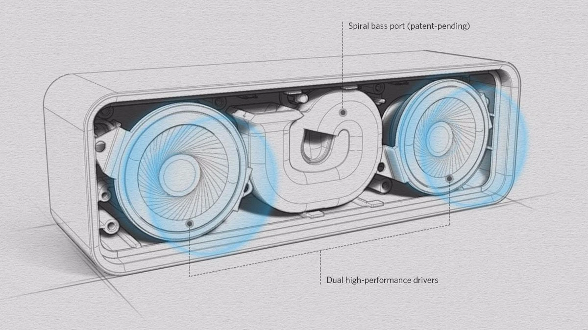 현재, 특허 출원 중에 있는 나선형 베이스 포트는 사운드코어의 독특한 특징 중 하나인데, 1% 미만의 왜곡률을 가진다고 한다. 이러한 낮은 왜곡률을 가진 베이스 전용 사운드 출력부가 스피커의 최고 볼륨에서도 최상의 사운드를 제공한다. 실제로 높은 볼륨에서도 저음이 깨지는 경우가 매우 드물었다.