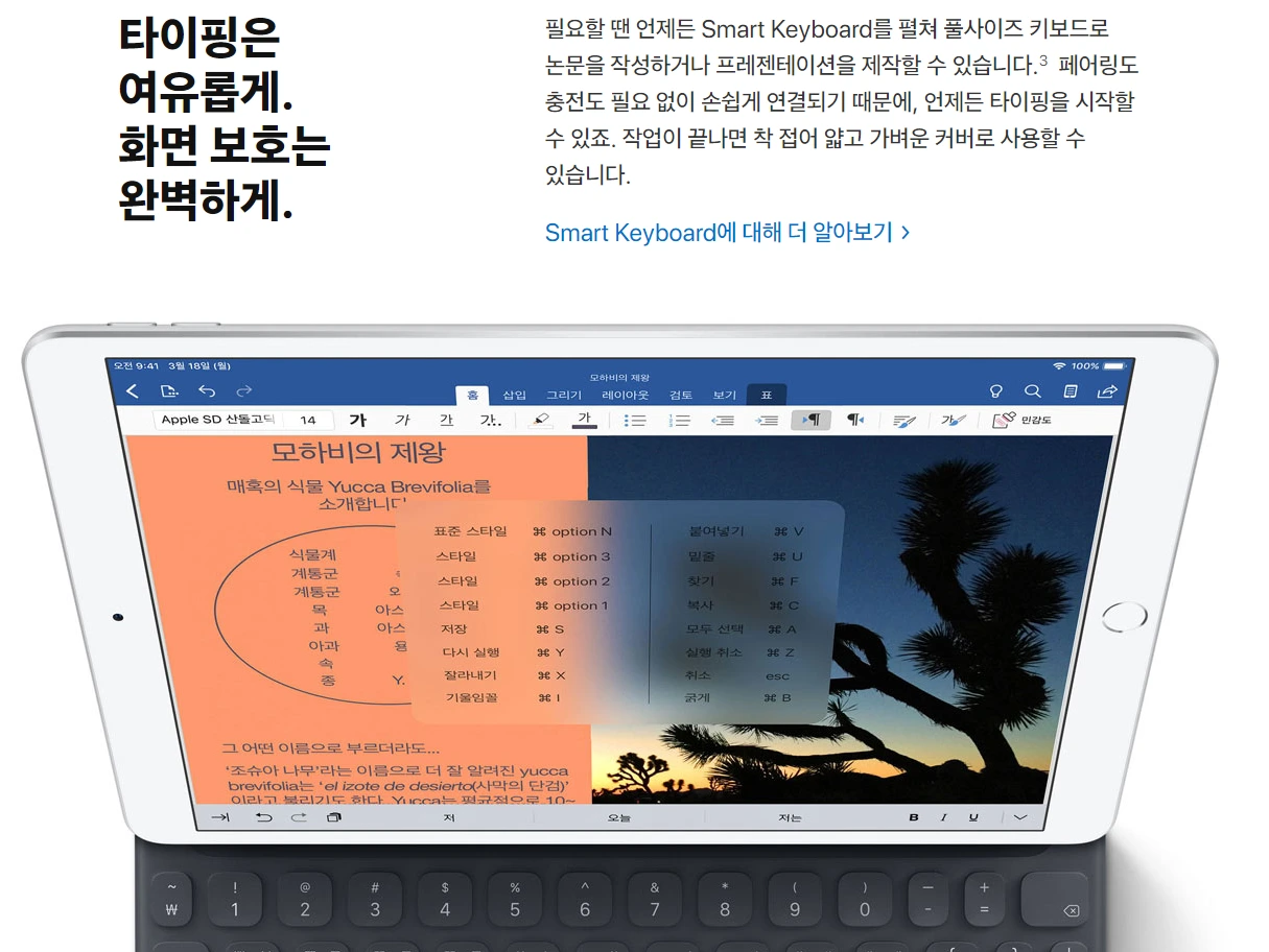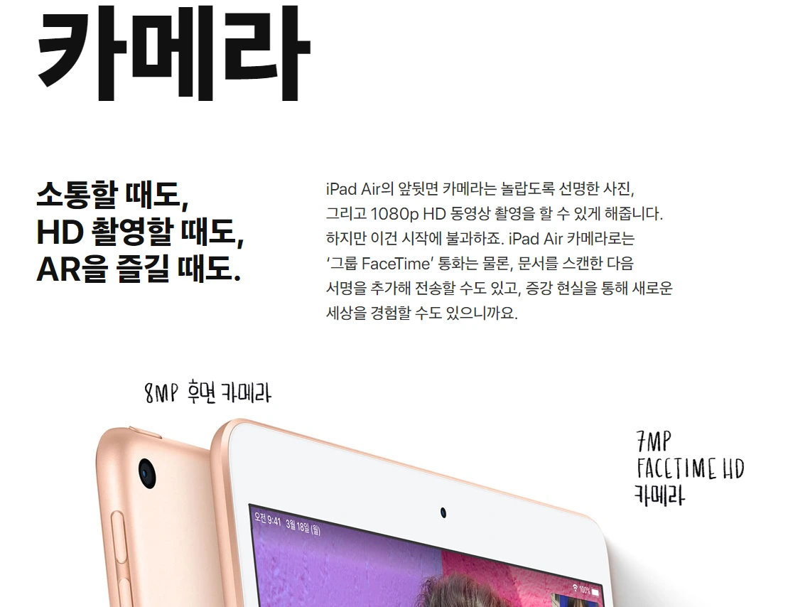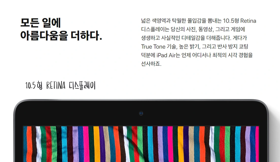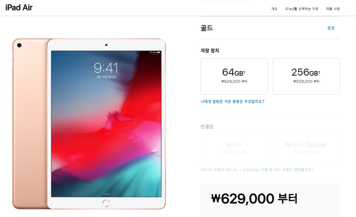 아이패드 프로 2세대 10.5형과 다른 점은 카메라와 디스플레이 프로모션을 제외하고, 성능 부분에서는 더 뛰어난 아이패드 에어는 한국 기준 64GB부터 629,000원이라는 아주 놀라운 가격으로 판매됩니다.