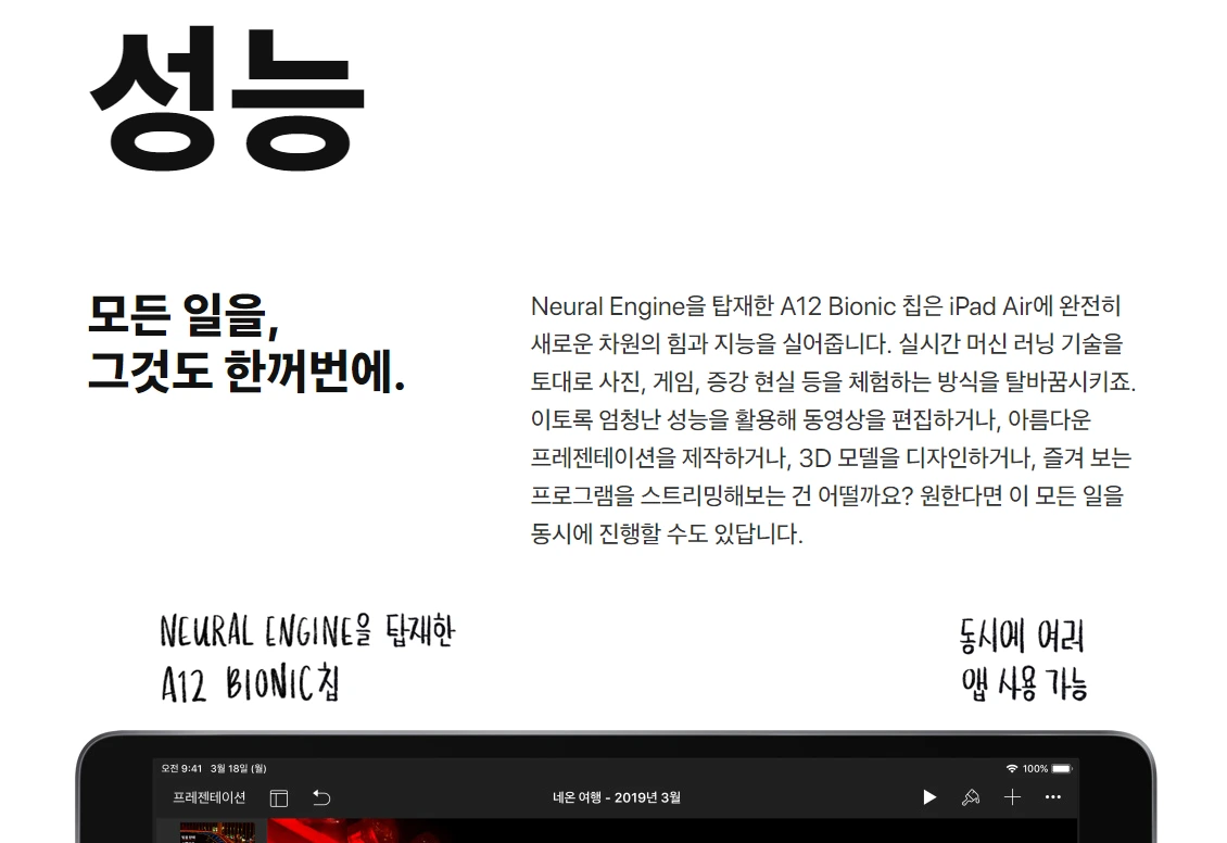 A12 바이오닉이 들어간 아이패드 에어는 기존 아이패드 프로 2세대보다 더 빠른 성능을 제공합니다.