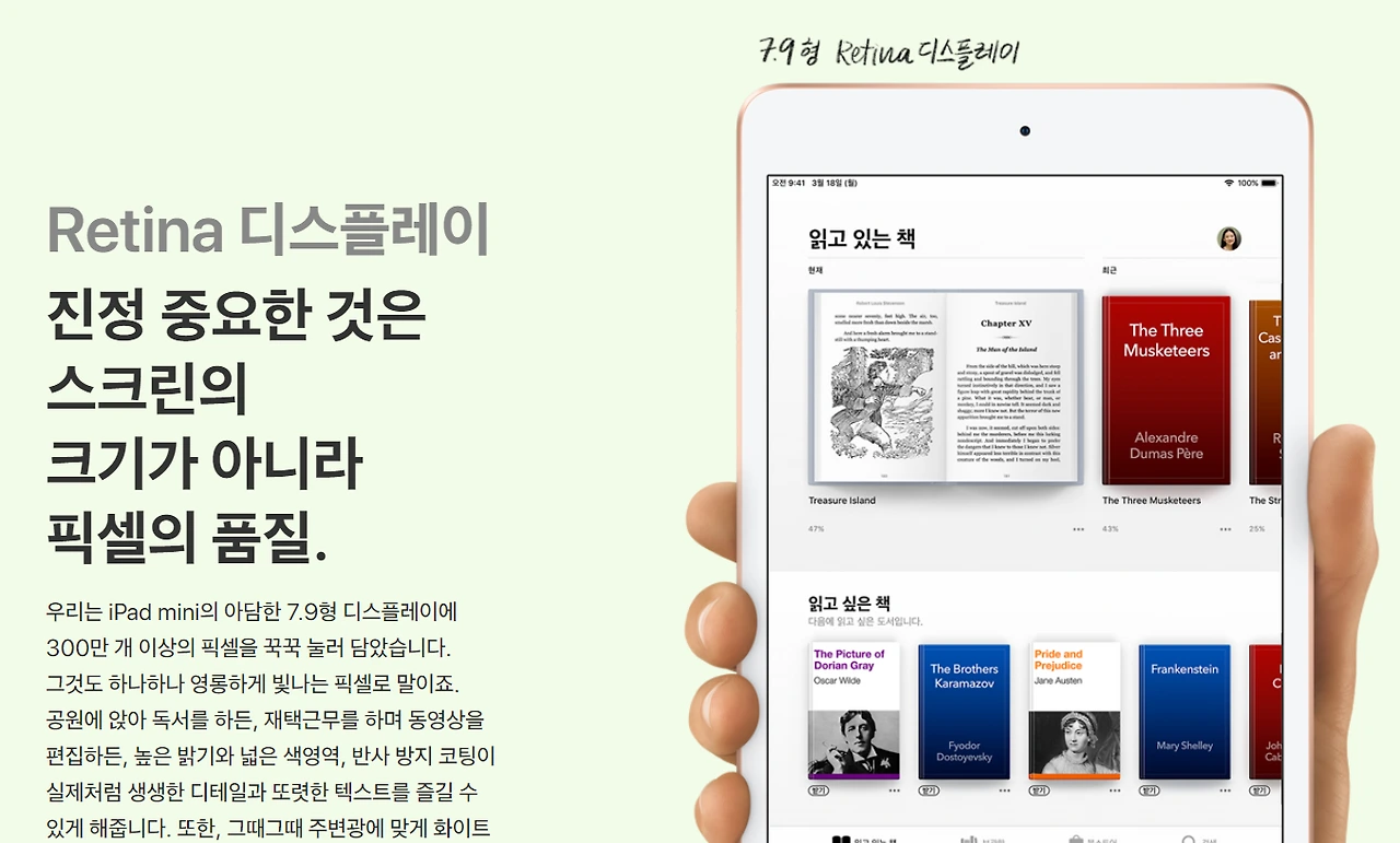 기존 아이패드 6세대 (2018)가 9.7형 레티나 디스플레이를 가지고 있었습니다.