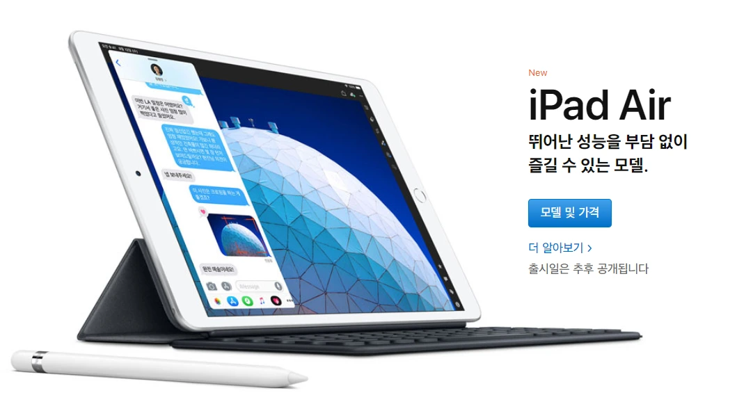 아이패드 에어는 기존 아이패드 6세대 (2018)의 후속작으로, 10.5형 디스플레이와 스마트 커넥터, 애플 펜슬 1세대 지원이 가능합니다. A12바이오닉 칩셋과 트루톤 디스플레이가 들어갑니다.