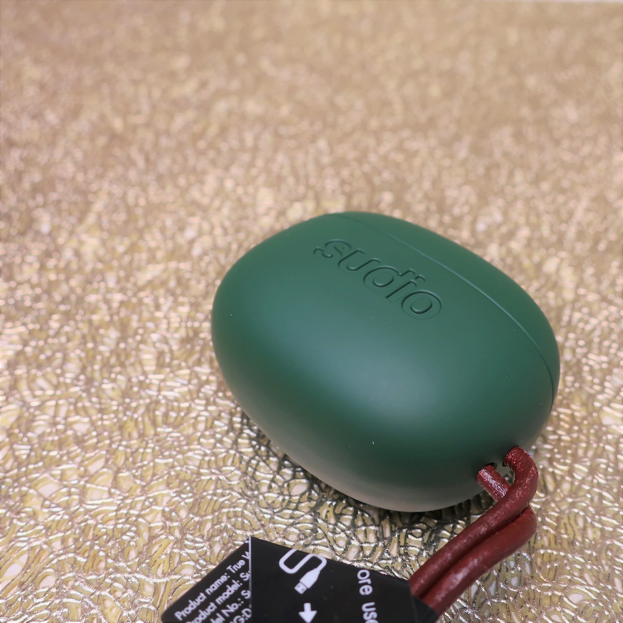 톨브는 최대 4회 충전이 가능한 케이스를 제공합니다. 조약돌처럼 작고 뚠뚠한 모양이며, 우측면에 짧은 스트랩이 있는 것이 특징입니다.